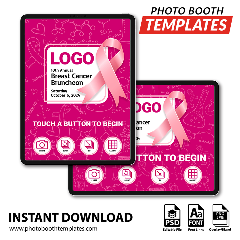 Turn your iPad photo booth app’s welcome screen into this theme that includes various science and research icons in the background, as well as a prominent pink ribbon alongside a large space for the logo and event details. It is ideal for breast cancer or pink ribbon-themed events, including corporate events, fundraisers, and more! The colors can be adjusted to suit any event theme.
