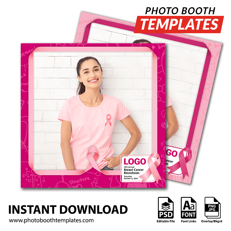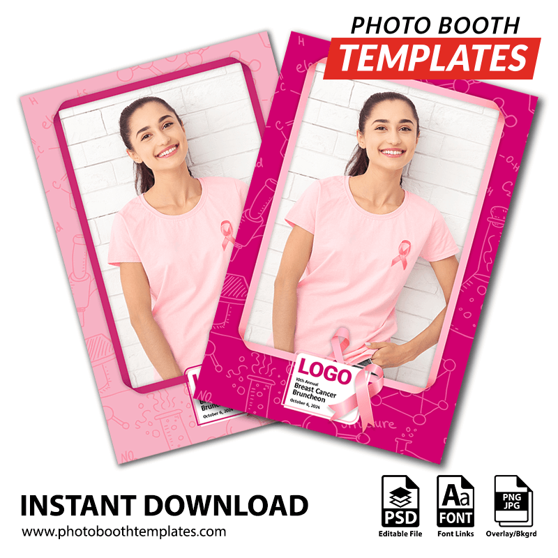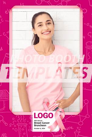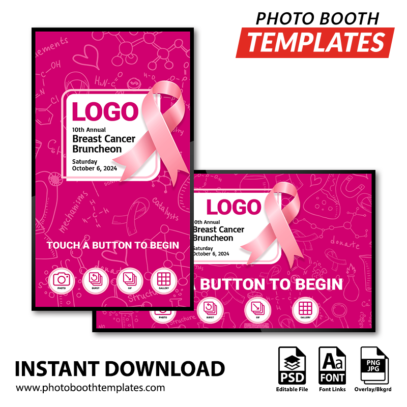 Turn your Surface Pro or PC-based photo booth application’s welcome screen into this theme that includes various science and research icons in the background, as well as a prominent pink ribbon alongside a large space for the logo and event details. It is ideal for breast cancer or pink ribbon-themed events, including corporate events, fundraisers, and more! The colors can be adjusted to suit any event theme.